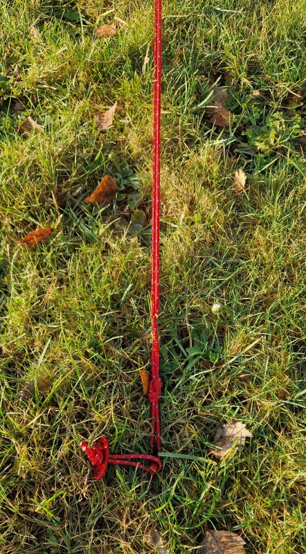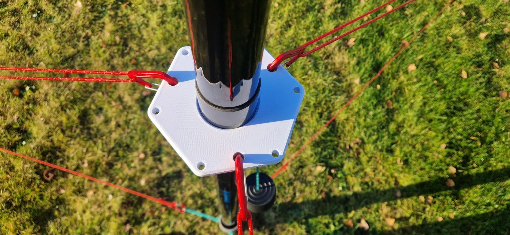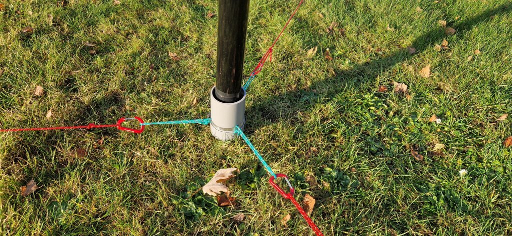 Iemand die erg goed naar de foto's kijkt zit dat ik de tuien ook vanaf de tentharing naar de mastvoet laat gaan. Dit is niet voor de stevigheid, maar ik kan zo makkelijker ongeveer 'een op het oog' de tuien ongeveer 120° uit elkaar zetten in een nette gelijkzijdige drie-hoek.