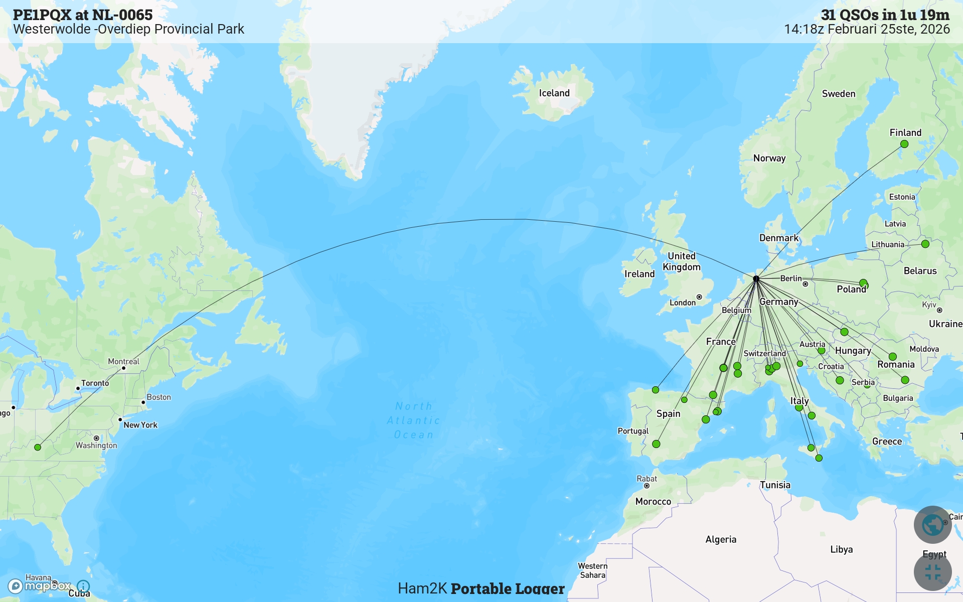Hieronder de kaart met de QSO's, waarvan ik één uit de USA heb kunnen loggen. Alles op 14MHz gewerkt.