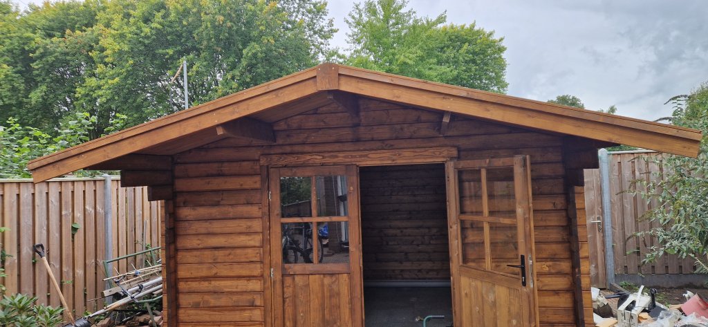 3 weken na het leveren van deze 'bouwpakket' is het blokhut nu bijna helemaal klaar. Dit moest wel tussen de werk-dagen en regenbuien door. Ik moet alleen aan de achterzijde er nog een ventilatierooster inzetten en dan alle spullen terug verhuizen uit mijn 'werkplaats'. De stellingkasten staan inmiddels ook op hun plek, dus het terugverhuizen kan beginnen.