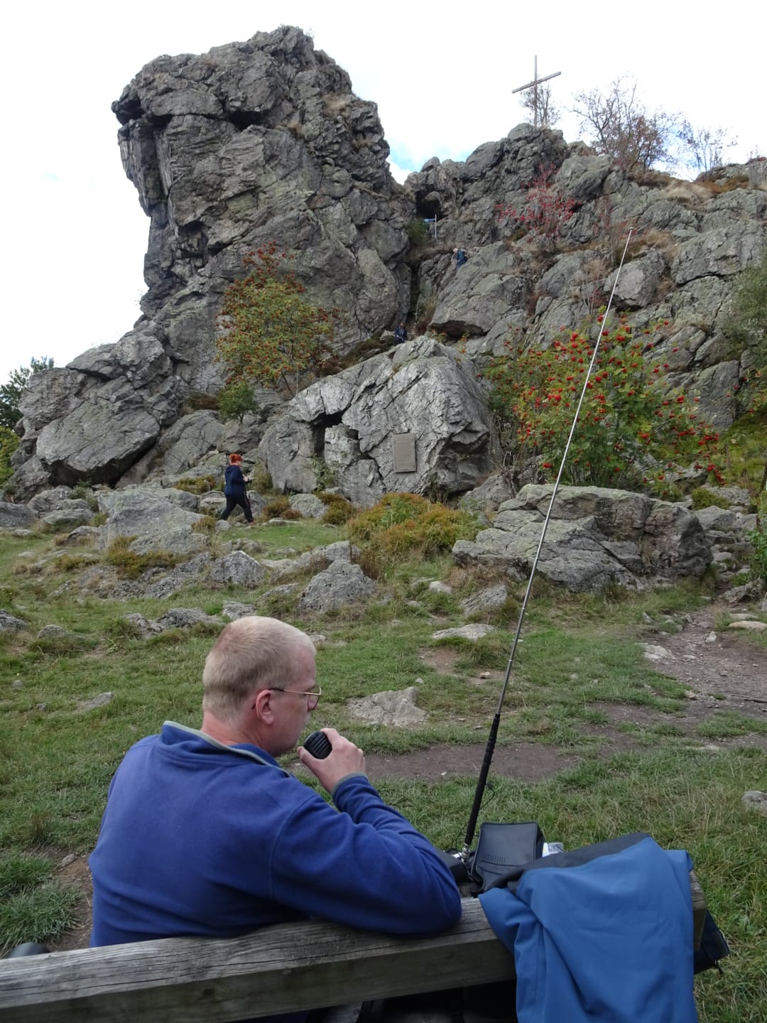 Mijn doel van 'portabel' QRV was deels geslaagd, ik was ON-AIR zonder gebruik te maken van 230Volt uit het stopcontact. Volgende stap was QRV zijn vanaf een volledig vrije locatie en deze had ik gevonden in de Bruchhauser Steine. Naast de Feldstein heb ik op een bankje de spullen uit de tas gehaald en daar een poging gedaan was QSO's te maken, zie foto rechts. Helaas waren de condities niet lekker en kwam ik nergens goed binnen, René hoorde op 40mtr wel dat ik een signaal zette maar kon er geen brood van maken.