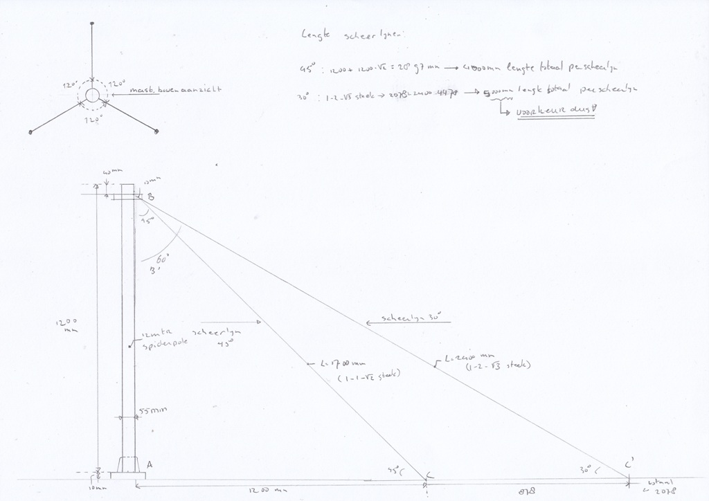 Rechtsboven heb ik de lengten van de scheerlijnen berekend, en je denkt dat deze te lang zijn. Klopt, maar ik zie graag dat de scheerlijn ook vanaf de punten C of C' naar A (aan de voet van de mast) gaan.