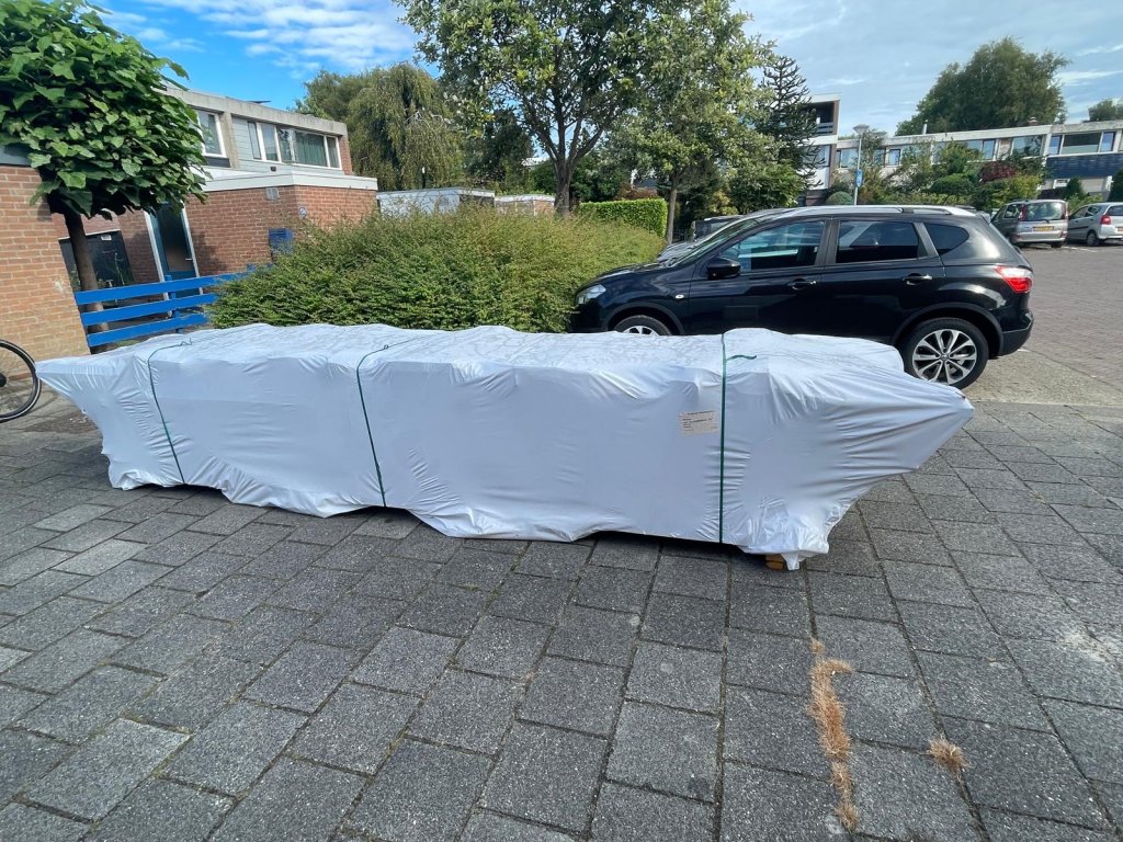 Op Vrijdag 29 augustus is onze nieuwe blokhut afgeleverd door Fa. Kijlstra. Na een knap staaltje (achteruit) sturen van de chauffeur is het pakket in één keer op de stoep gezet zo dicht mogelijk bij onze deur.