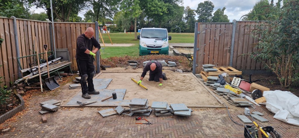 Nog voor 11.00u 's ochtends waren de heren stratenmakers klaar en lag alles er netjes strak in. De fundering lag mooi vlak en waterpas, dus het opbouwen van het nieuwe blokhut kon in principe beginnen.