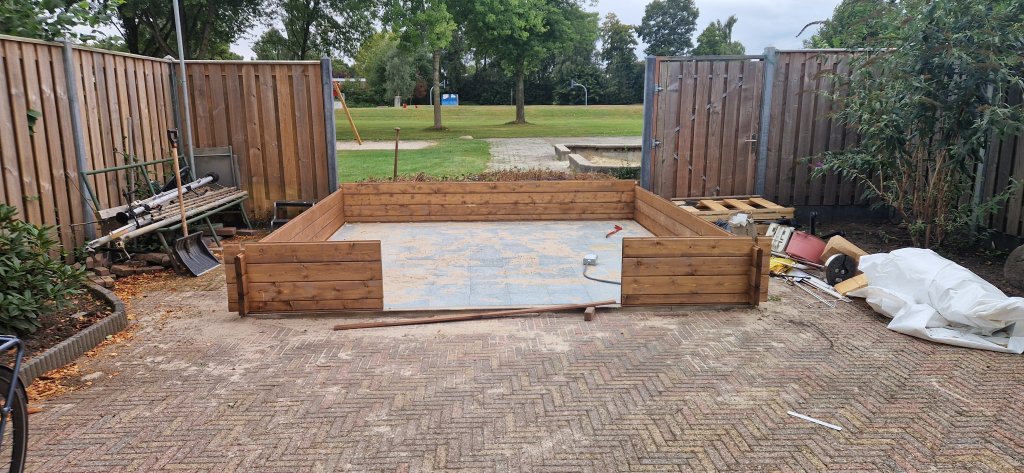 Helaas liggen enkele tegels (keramiek tegels blijkt nu) nog wel los, maar dat is geen probleem hier. Er ligt nog wat zand op om nog eens in te wassen.