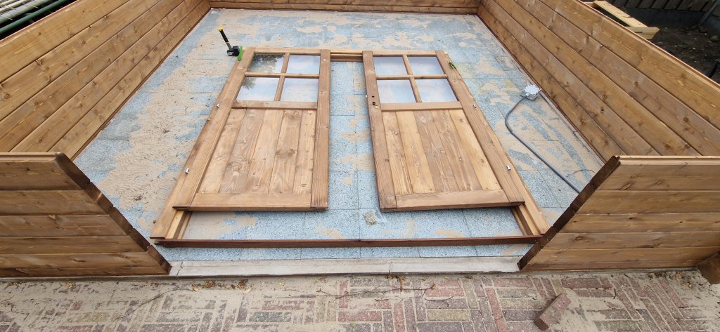 Nu kon ik alles netjes opbouwen tot en met het dak aan toe. Nu bleek wel dat het kozijn er niet waterpas in zat en dit kon ik niet helemaal zelf oplossen. Gelukkig is er altijd wel iemand met kennis (en gereedschap) die hier zijn hand niet voor omdraait. Ik had één zijde van het kozijn wel al waterpas kunnen maken, maar de andere zijde was een stuk lastiger. Dus één deur zat er al in.
